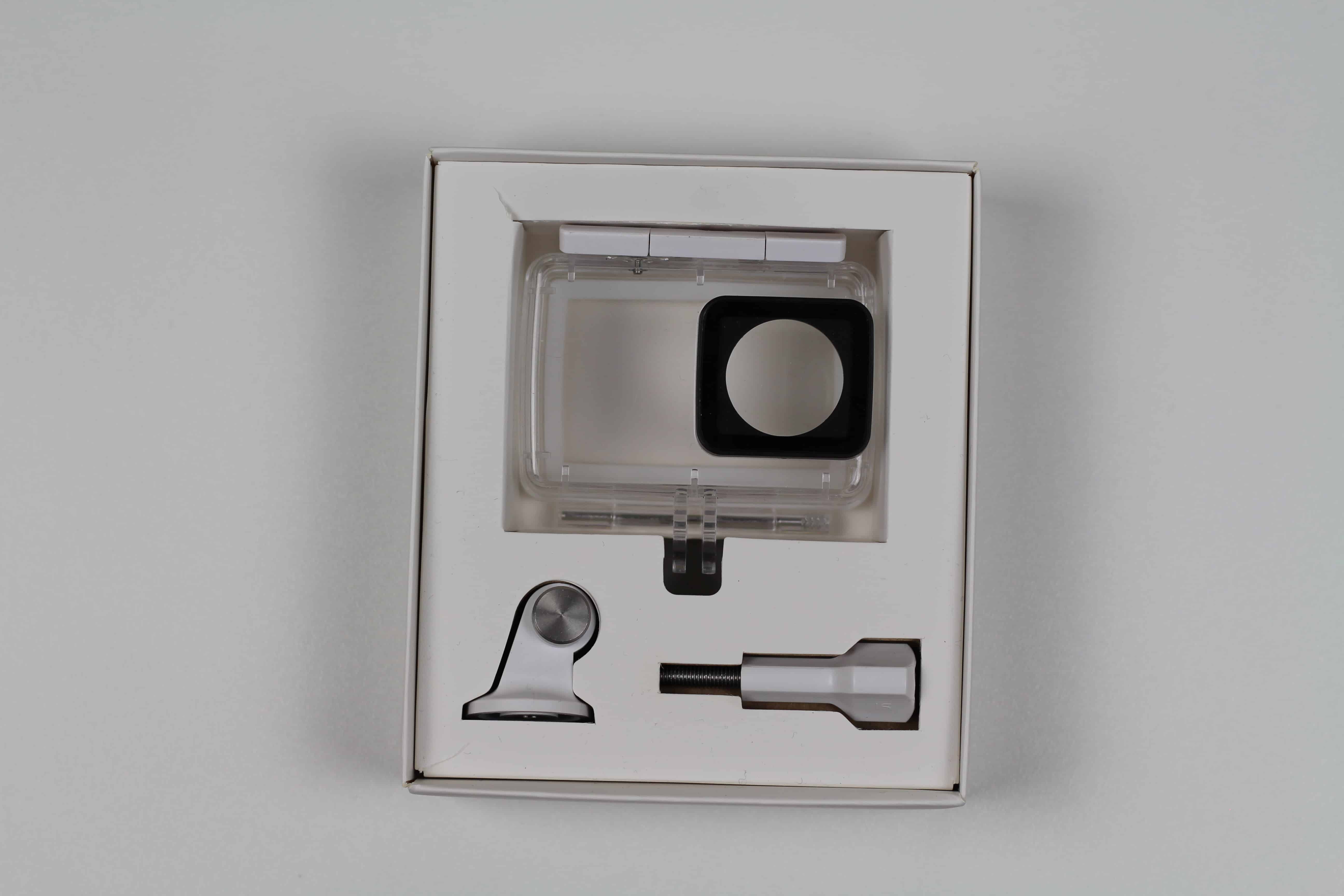 Testiin toimitettiin erikseen myös vedenkestävä suojakotelo, joka on lähes pakollinen hankinta. Kuoren pohjassa on sama liitin kuin GoPro kameroiden koteloissa. Eli kaikki GoPron varusteet käyvät suoraan myös Xiaomin Yi 4K -kameraan. Kosketusnäytön käyttö on mahdotonta, sillä kotelo peittää kokonaan kosketusnäytön. Päällä oleva nappi toimii kuitenkin normaalisti. Kotelo suojaa kameraa loistavasti, mutta kuitenkin rajoittaa kameran käyttöä huomattavasti.